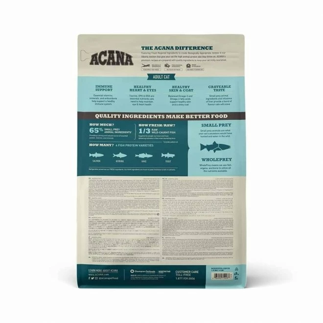 Acana Cat Adult Bountiful Catch er en tørrfôr av høy kvalitet, som er spesielt tilpasset voksne katter. Fôret er basert på flere forskjellige fisker; laks, sild, lyssing og ørret, men fôret inneholder også for eksempel linser og gresskar.