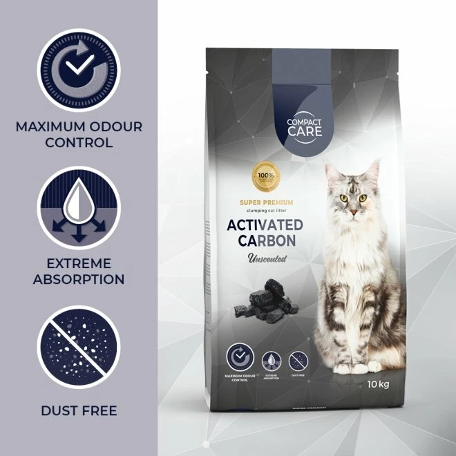 Compact Care Activated Carbon Unscented er en ekstremt effektiv kattesand av høy kvalitet med aktivt kull. Kattesanden er uparfymert og inneholder 100% naturleire, aktivt kull. Passer godt til hjem med flere katter eller ukastrerte hannkatter. Når katten har gjort fra seg dannes tette klumper som er enkel å fjerne. Vær nøye med å ta bort klumpene daglig, da katter er svært renslige dyr, som er følsomme mot skitt. Den optimale klumpdannende evnen motvirker både vond lukt og at bakterier kommer i kontakt med bunnen av kattetoalettet.
