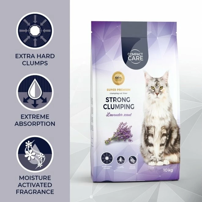 Favoritten Compact Care Premium Lavendel har fått en ny oppskrift. Sanden er av høy kvalitet og inneholder naturleire, zeolit og parfyme. Den klassiske lavendel-duften aktiveres når sanden blir fuktig. Når katten har gjort fra seg dannes tette klumper som er enkel å fjerne. Vær nøye med å ta bort klumpene daglig, da katter er svært renslige dyr, som er følsomme mot skitt. Den optimale klumpdannende evnen motvirker både vond lukt og at bakterier kommer i kontakt med bunnen av kattetoalettet.