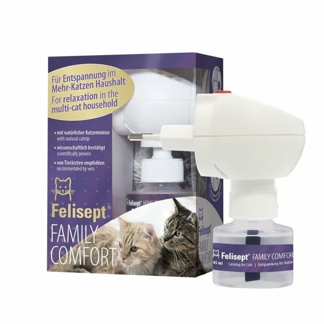Felisept Family Comfort er en duftspreder med kattemynte. Selve duftgiveren, diffuseren, plasseres i en stikkontakt på veggen, og kattemynten – eller rettere sagt duften av kattemynte – spres i hjemmet.