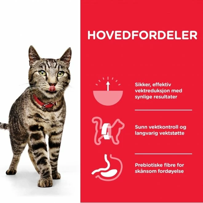 Fôret har et lavt fettinnhold og inneholder klinisk bevist næring for å hjelpe katter til å oppnå en sunn vekt. Det ekstra høye innholdet av protein og et lavt innhold av fett gir optimalt balansert næring for overvektige katter.