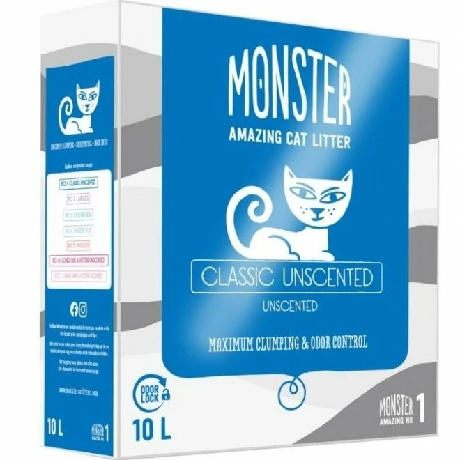 Monster Classic Unscented kattesand er en uparfymert kattesand som klumper seg raskt og etterlater seg lite støv. Selv om kattesanden er uparfymert, er den veldig god på å forhindre dårlig lukt i kattetoalettet. Dette skjer ved at klumpene dannes så raskt og effektivt at urinen ikke når bunnen av kattetoalettet. Når urin når bunnen, lukter det mye mer, og kattetoalettet må rengjøres oftere.