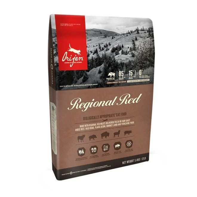Din lille katt er et rovdyr og er av naturen utviklet til å spise en diett rik på fersk kjøtt, derfor inneholder Orijen Regional Red 85% av alle animalske ingredienser. Kjøttet kommer fra angus, villsvin, bison, Romney lam og Yorkshire gris. De fleste næringsrike dyreråvarer som kjøtt, tarm og brusk brukes, bare zink, kobber og kolin blir tilsatt, noe som betyr at katten får alle næringsstoffene det trenger. Fôret er helt fri for syntetiske tilsetningsstoffer og kunstige konserveringsmidler. Fôret er også fritt for korn, og innholdet av lavt karbohydrat kommer fra frukt, grønnsaker og urter. Regional Red inneholder elementer av frysetørret torskelever som naturlig øker smaken, noe som gjør den uimotståelig, selv for den mest kresne katten!