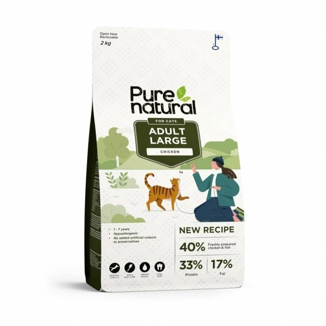 Purenatural Cat Adult Large Chicken er en ny versjon av det gamle Purenatural-fôret med samme navn. Forskjellene er at ørreten er byttet ut med fersk nordisk laks, og at det ikke lenger tilsettes natriumklorid i fôret – i stedet kommer dette fra ingrediensene. Til denne nye versjonen har de også valgt å legge til glukosamin og kondroitinsulfat, som jobber for å fremme god leddhelse. Fôrkulene har omtrent samme størrelse og form, men kan oppleves som litt lysere.