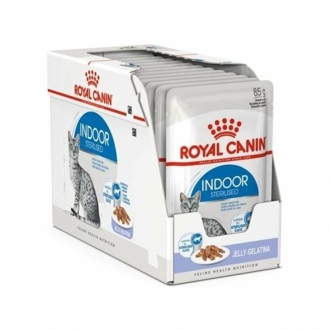 Royal Canin Indoor in Jelly Adult er et våtfôr til voksne og steriliserte innekatter. Det smakfulle fôret består av biter i gelé, som er med på å fremme en sunn urinveishelse. Fôret er spesielt utviklet for å ta hensyn til innekattens fordøyelse som ofte er langsommere, og for at katten skal opprettholde sin idealvekt.