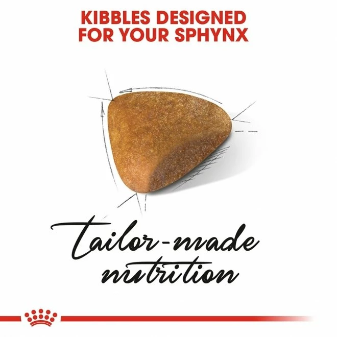Royal Canin Sphynx er kattemat spesielt utviklet for sphynxkatter eldre enn 12 måneder. Royal Canin Sphynx har et høyt energiinnhold for å imøtekomme sphynxkattens ekstra høye energibehov. Kattematens forbiterer særskilt utformet for at sphynxkatten med sin spesielle kjeve skal stimuleres til å tygge kattematen ordentlig, samtidig som kattematen inneholder emner som motvirker oppblomstringen av tannstein. Royal Canin Sphynxs spesielle sammensetning av næringsstoffer holder sphynxkattens hud frisk og beskytter den mot uttørking. Royal Canin Sphynx hjelper også til å holde din Sphynxkatt vital langt opp i årene gjennom tilskudd av blant annet taurin.