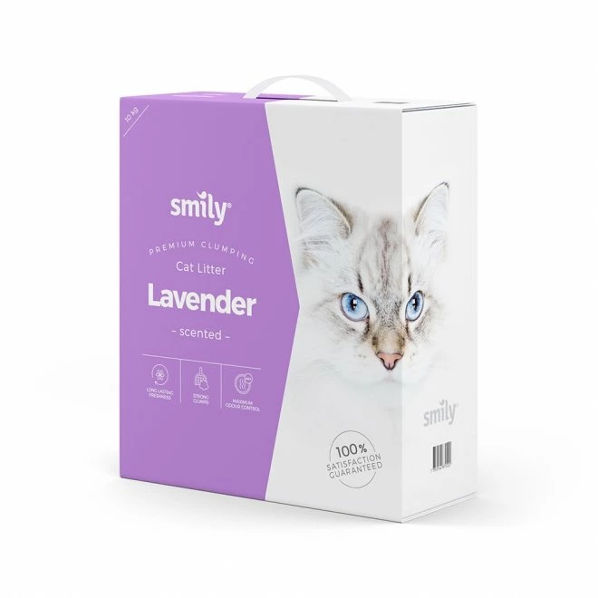 Smily Kattesand Lavendel er en kattesand med en duft av lavendel av høy kvalitet. Kattesanden er 99% støvfri, har god klumpdannelse og absorberer dårlig lukt effektivt. Smily Kattesand er et rent naturprodukt laget av mikro-bentonitt leire. Kattesanden har en enestående klumpegenskaper – den klumper seg raskt og begrenser dermed dårlig lukt. Kattesand fra Smily er finkornet og passer til følsomme poter.