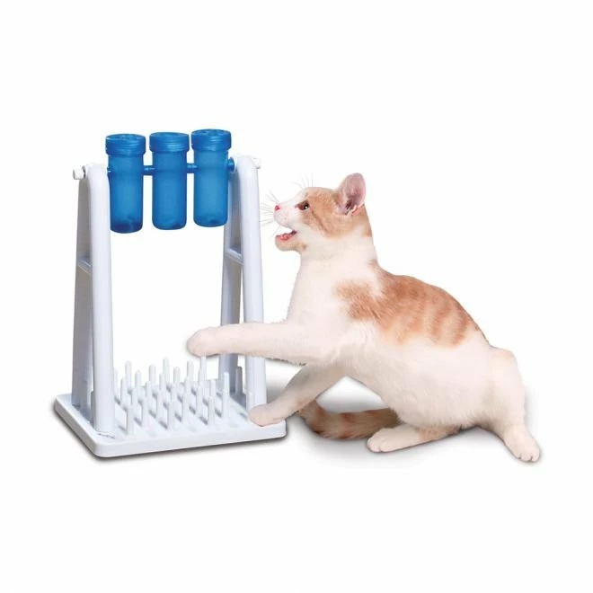 Sett godbiter eller tørrfôr inn i rørene øverst i leken og la katten jobbe for maten sin. Det er naturlig for katter å fundere over hvordan de jakter på en mus eller henter en godbit ut fra en krukke.